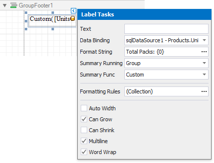 Drop a required data field onto the group footer to display the summary result. Click the label's smart tag and set its Summary Running property to Group. Set the Summary Func property to Custom and use the Format String property to format the summary's value.