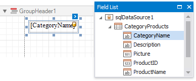 Switch to the Field List and drop the group field onto the created Group Header.