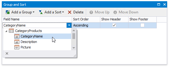 Switch to the Group and Sort panel and create a new group. Enable the Show Header option to display the Group Header in the report.