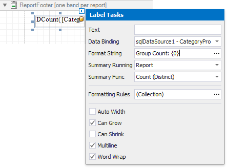 Set the Summary Func property to Count (Distinct) and use the Format String property to format the summary's value.