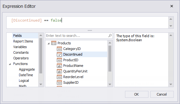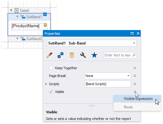 Here, the [Discontinued] == false expression is set for the SubBand1 and the [Discontinued] == true expression for the SubBand2. These expressions specify the Visible property based on the Discontinued data field's value.
