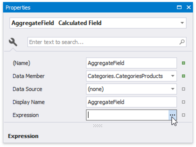 In the invoked Expression Editor, double click the [CategoriesProducts] field and choose Functions | Aggregate. Then, double click the Count() function and insert the following text into the empty square brackets: