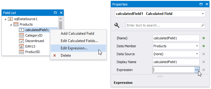 The Expression Editor displays only those data fields that are obtained from a data source specified by the calculated field's Data Source and Data Member property values.