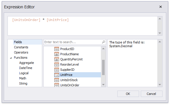 In the invoked Expression Editor, construct the required expression. You can use data fields, report parameters, predefined constants as well as various date-time, logical, math and string functions. See the next document section for more information about expression syntax.
