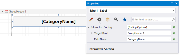 Use the label's Interactive Sorting option to allow users to click this label in Print Preview to sort report data. Set the Target Band property to the Group Header or Detail band, and specify the data field in the Field Name property.