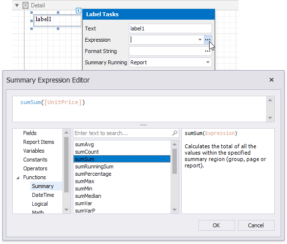 Specify a data range in the Summary Running property and select the summary function in the Summary Expression Editor to make the label display a summary function's result.