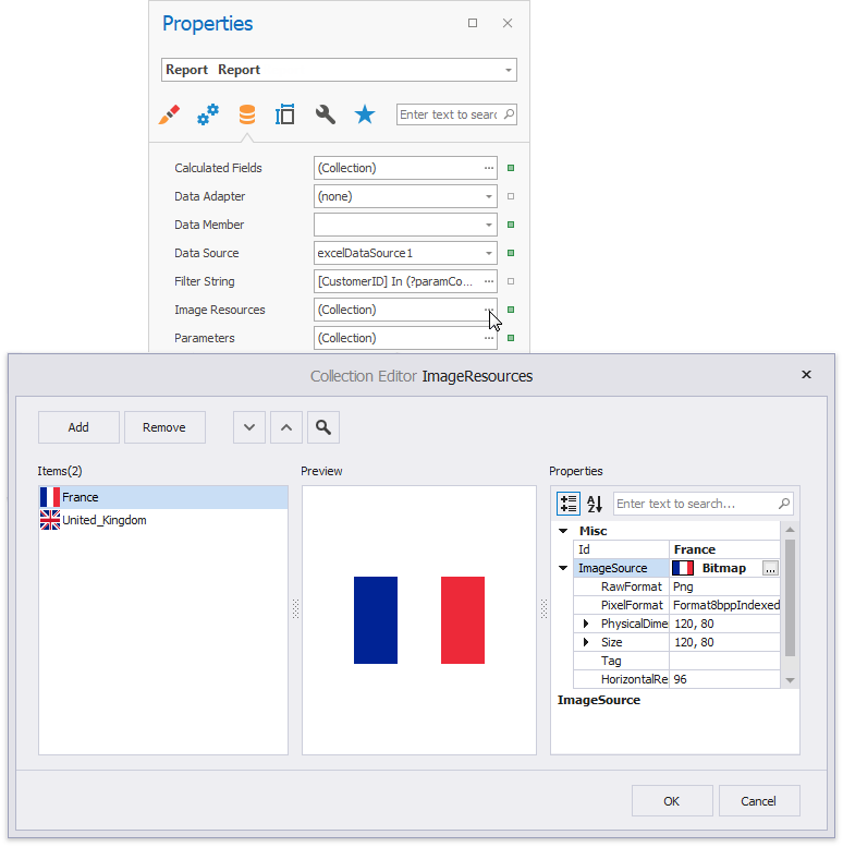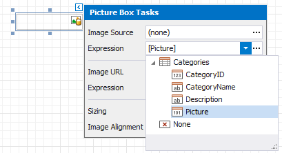 Click the Picture Box's smart tag. In the invoked menu, click the Expression option's ellipsis button to open the Expression Editor. Choose an image from the Images collection: