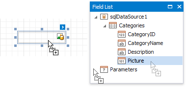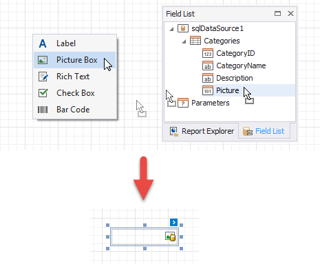 Right-click a data field in the Field List and drop it onto a report band. Select the Picture Box item in the invoked context menu.