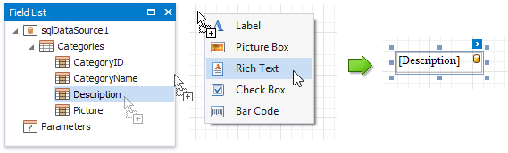 You can also drag and drop any field from the Field List with the right mouse button and select the Rich Text menu item. This creates a new Rich Text control bound to this field.