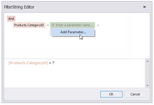 On the right side, use a chart parameter to obtain a group value from the report's group field. Click the right side's icon until it turns into a question mark and select Add Parameter from the context menu to invoke the Add New Parameter dialog.