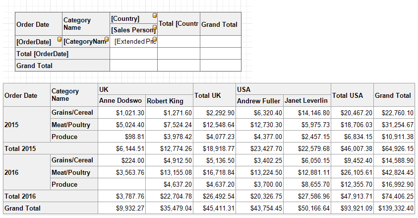 The Cross Tab control displays data in rows and columns. You can specify what data to use as row/column headers, and what data should be shown at row and column intersections. You can also determine how to group, sort, format and lay out data.
