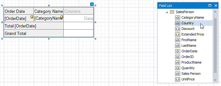 You can drop two or more data fields onto the same area to create a hierarchy. The first field's values are displayed at the root level (the first column/row), the second field's values are grouped by the first field's values and displayed at the second hierarchy level (the second column/row), and so on.