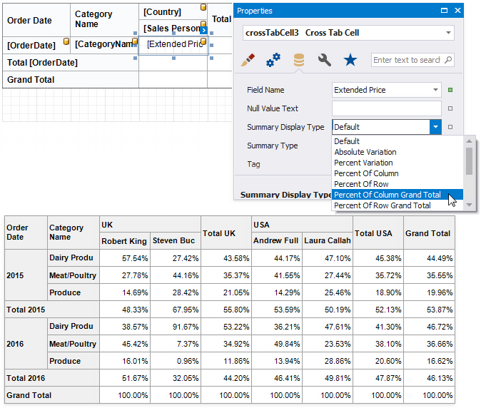 Use the Summary Display Type property to display results' contribution to other cell values, for example, as a percentage of grand total values.