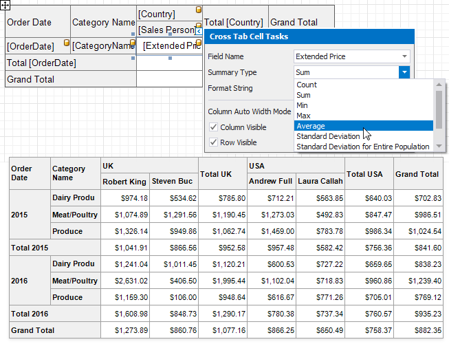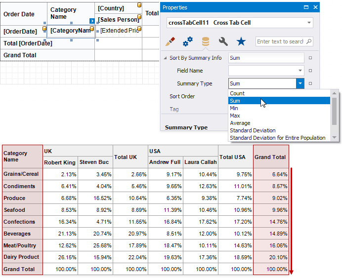 - Use the Summary Type property to specify which summary function to calculate. The summary type can differ from the summary type currently used in the Cross Tab.