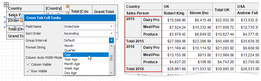 The Cross Tab displays unique values of column and row fields and does not group their values.
