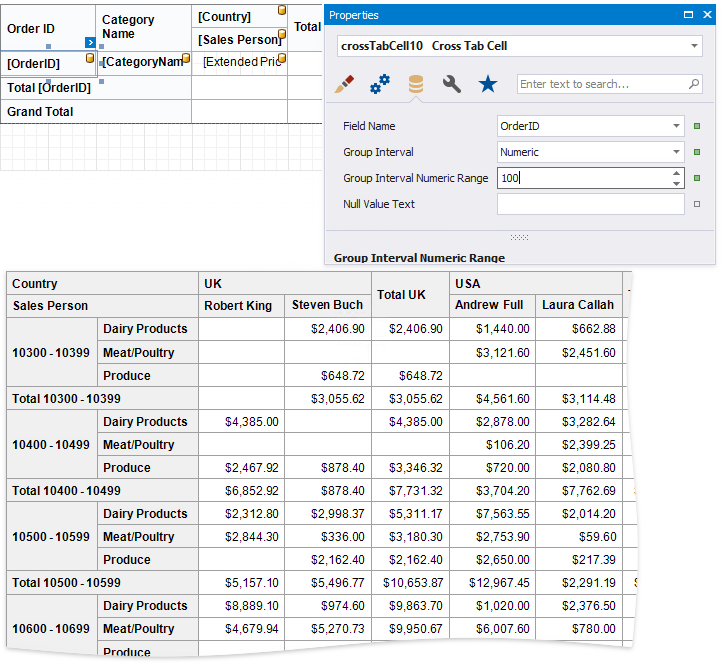 To group numeric values, set the Group Interval property to Numeric and use the Group Interval Numeric Range property to specify the interval length. For instance, set the range to 100 to group records by 100 orders.