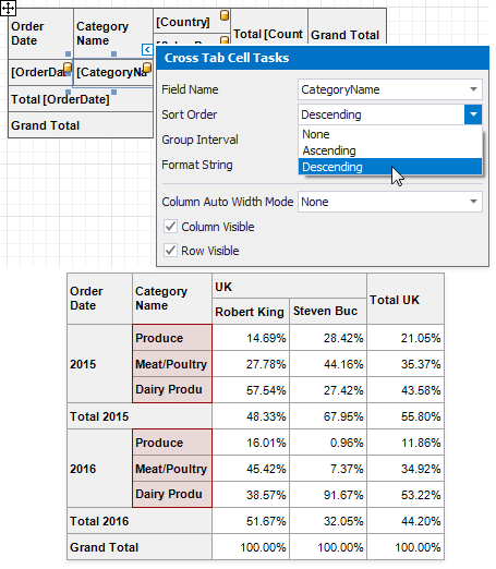 The Cross Tab displays row and column field values in the ascending order. Use the Sort Order property to change the current sort order. Set this property to None to keep the same order as records in the Cross Tab's data source.