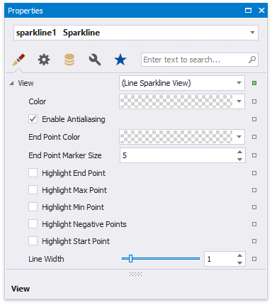 Specific properties differ between view types, such as the Highlight Negative Points setting that is available only for the Bar sparkline.