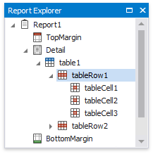 The table control contains one or more rows. Each row contains one or more cells. See the Report Explorer for a table structure example.