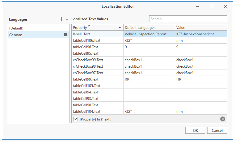 When the Localization Editor is invoked, the grid in the right panel displays values for the report controls' Text properties. You can click the filter icon in the Property column header to modify a filter and select other properties or clear the filter to show all textual properties.