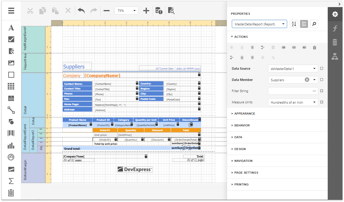 The Web Report Designer allows you to create data-bound reports and provides a rich set of tools to construct report layouts that meet your requirements.