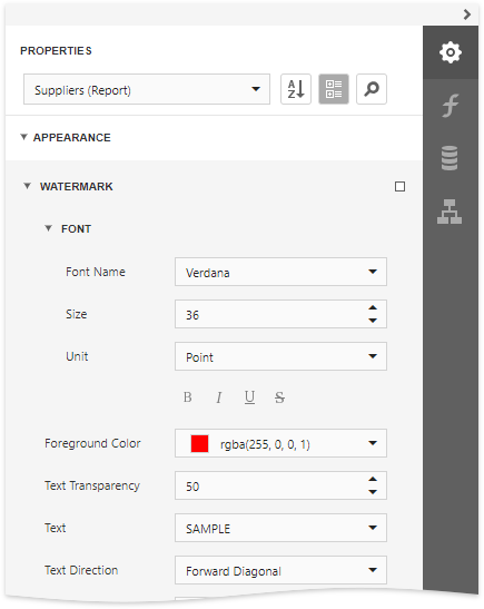 Switch to the Properties panel and expand the Watermark node in the Appearance category.