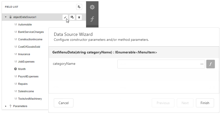 Choose an ObjectDataSource component in the Field List and click Edit Parameters. Reconfigure the parameters on the invoked wizard page and click Finish to apply the changes.