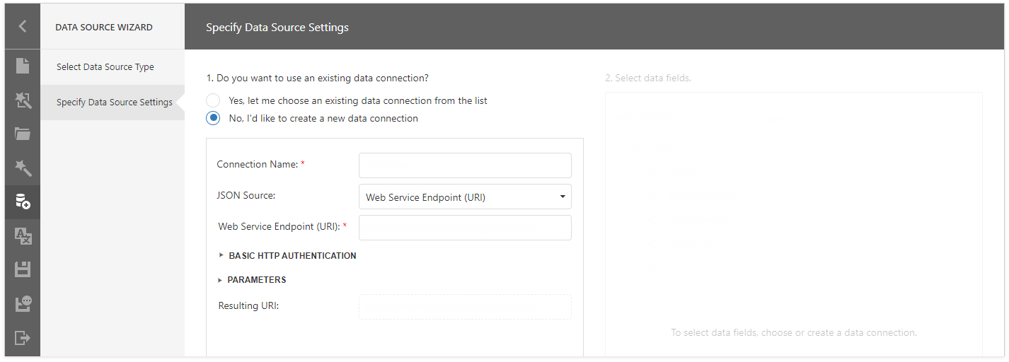 If you prefer to create a new data connection, specify its settings. You can use a Web Service Endpoint, a filename, or a string with JSON data. In this example, the JSON data is obtained from a JSON sample data location.