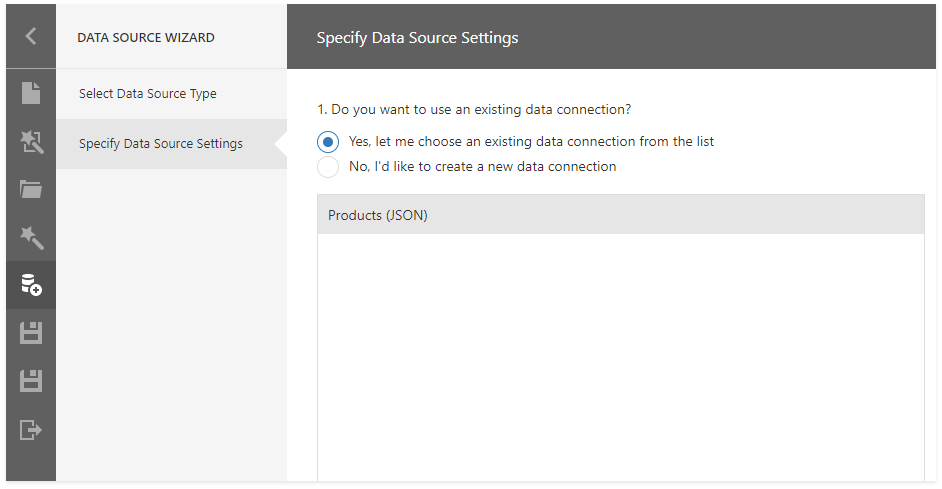 The next wizard page allows you to specify whether you want to use an existing data connection or create a new data connection.