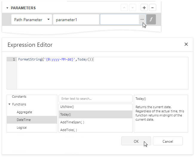 button and use an expression to set the parameter value.Click the Value property's ellipsis button. Specify the expression in the invoked Expression Editor and click OK.