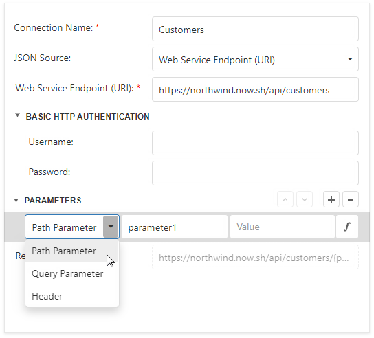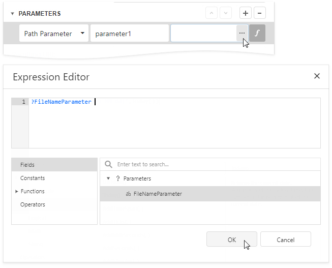 Expressions can include report parameters. In the Expression Editor, expand Parameters, select a report parameter to which you want to bind the path parameter, query parameter, or header parameter, and click OK.