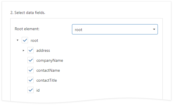 This wizard page also shows the specified JSON data's structure. You can choose all nodes or a subset of nodes.