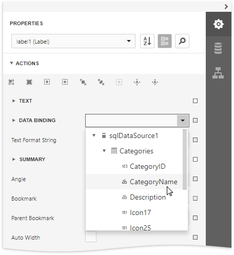 You can use the Properties panel to bind a report control to a data field. Select the control, expand the Data Bindings drop-down list in the Actions category and choose a data field.