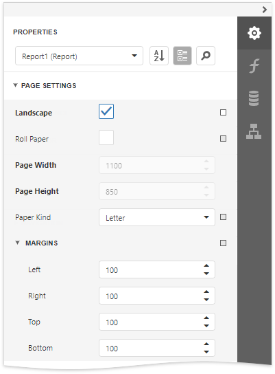 While designing the report, you can specify the report's page settings in the Properties panel. Expand the Page Settings category to access this options: