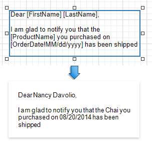 Add the required text to the control and embed data fields' names into it, surrounded by [ square brackets ], as shown in the following image: