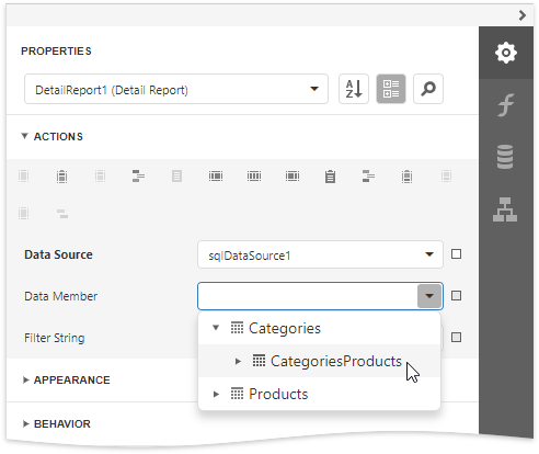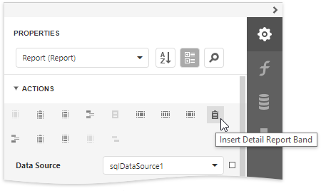 Expand the Actions category and click Insert Detail Report Band to create a Detail Report Band.