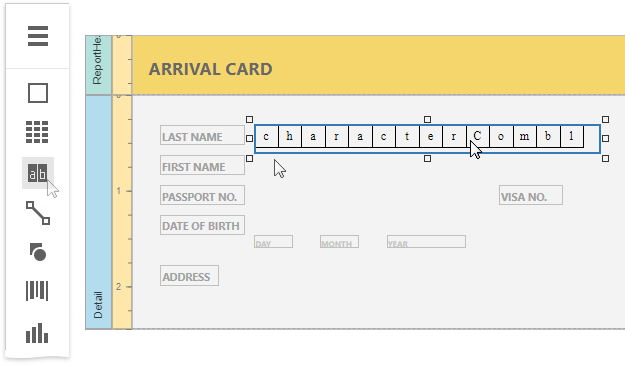 Use the Character Comb control for the form's text fields. This control displays letters in individual cells and allows end users to fill these cells in Print Preview.