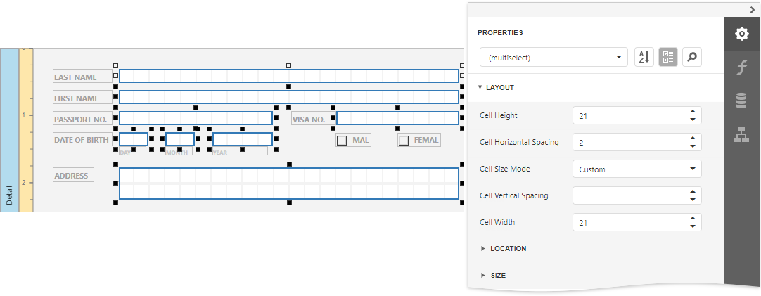 Add two Check Box controls to the report for selecting a gender (Male/Female fields). Then, change their text and appearance settings.