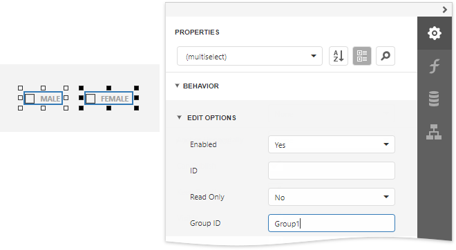 To enable switching check box states in Print Preview, expand the Behavior category, select the Edit Options section and set the Enabled property to Yes as you did before. To allow selecting only one option at a time, combine these check boxes into a logical group by specifying the same value for the Group ID property.