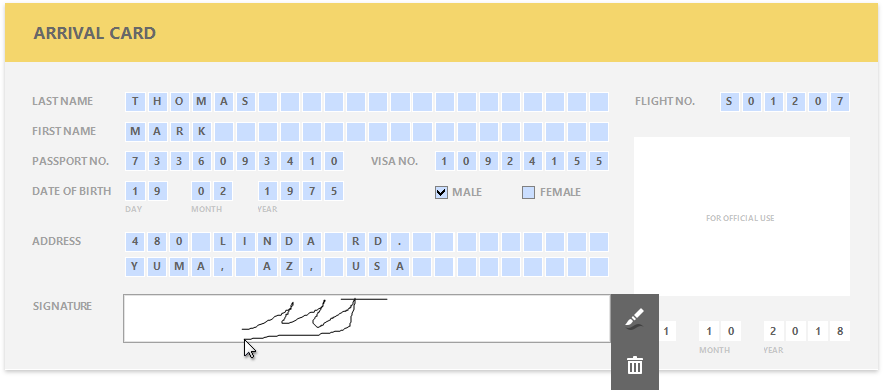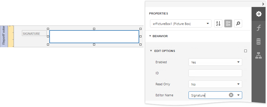 Switch to the Properties panel and adjust control's appearance settings. Expand the Behavior category and select the Edit Options section. Set the Enabled property to Yes and the Editor Name property to signature to enable drawing in Print Preview.