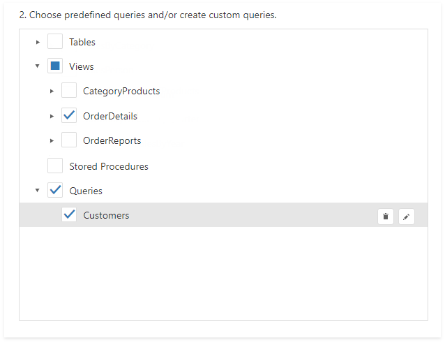 Obtain data from two different tables to display information about customers and orders at the same hierarchical level in the report. Click the plus button for the Queries category to create a custom query. In the invoked Query Builder, add the required data tables to a query and join them based on a key column.