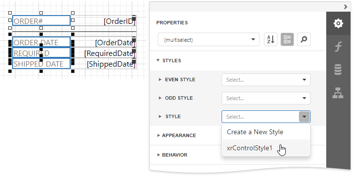 Select report elements, expand the Styles category and choose a style in the Style property's drop-down list to apply the style to the selected elements.