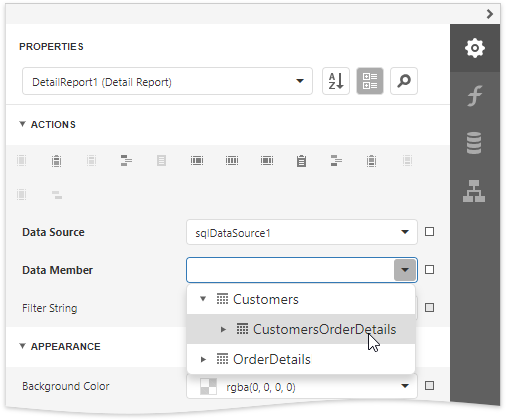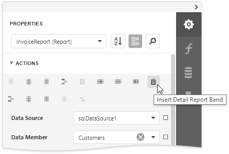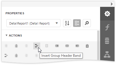 Expand the Actions category and click Insert Detail Report Band to create a Detail Report Band.
