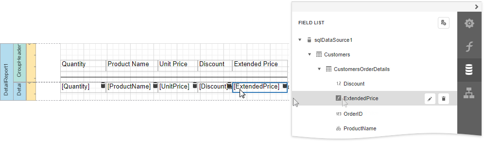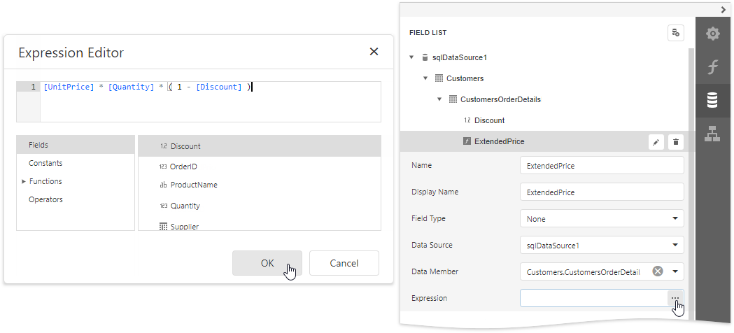 Click the Edit button for the calculated field and change its name to ExtendedPrice. Click the Expression property's ellipsis button, and in the invoked Expression Editor, construct the expression based on the UnitPrice, Quantity and Discount fields.
