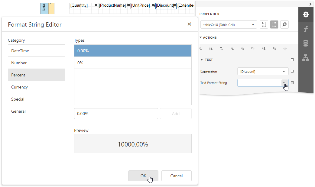 Select the table cell bound to the Discount data field in the detail report's Detail band. Expand the Actions category, click the Text Format String property's ellipsis button, and in the invoked Format String Editor, apply the Percent format. In this case, field values are multiplied by 100 and displayed with a percent symbol.