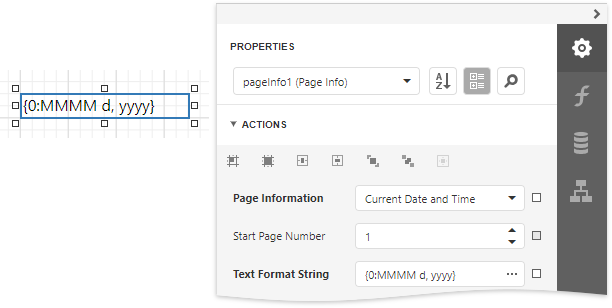 Expand the Actions category and set the Page Information property to Current Date and Time. Click the Text Format String property's ellipsis button, and in the invoked Format String Editor, select a date format as in the Format Data section above.