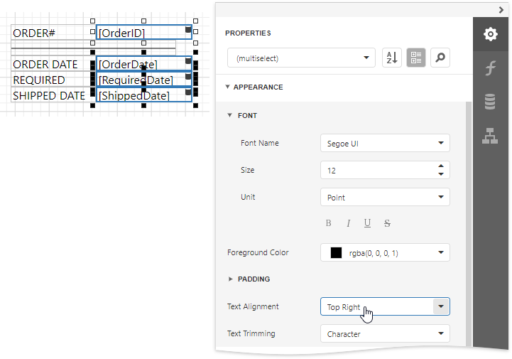 Click the gray area around the design surface to select the report, and in the Properties panel, specify the font settings. These settings are distributed to all report elements.