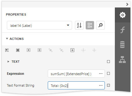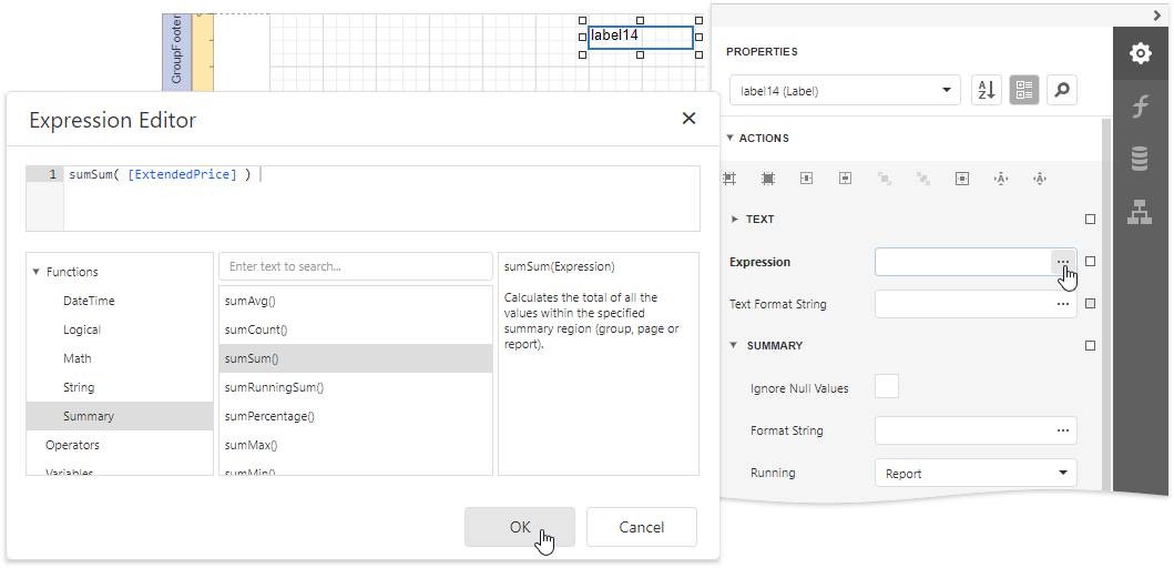 Drop the Label control onto the added band and expand the Actions category in the Properties panel. Select the Summary section and set the Running property to Report to calculate the summary for the entire detail report and click the Expression property's ellipsis button. In the invoked Expression Editor, specify the following expression to calculate the total price:
