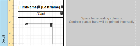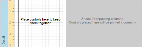 After performing the above steps you will see that the report's Detail band is now divided into three differently colored areas. The first area at the left-hand side indicates the actual available band area for controls to be placed within it. The gray area at the right-hand side is intended for the columns in which labels will be displayed, so it cannot be occupied by controls. Finally, the white area specifies an indent between the available and reserved areas.