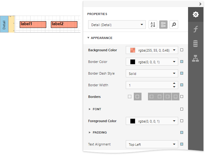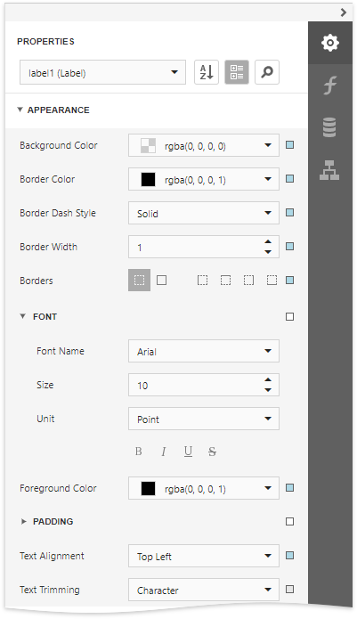 | Font | Gets or sets the font options (its name, size, etc.) to a report element and its child controls. |